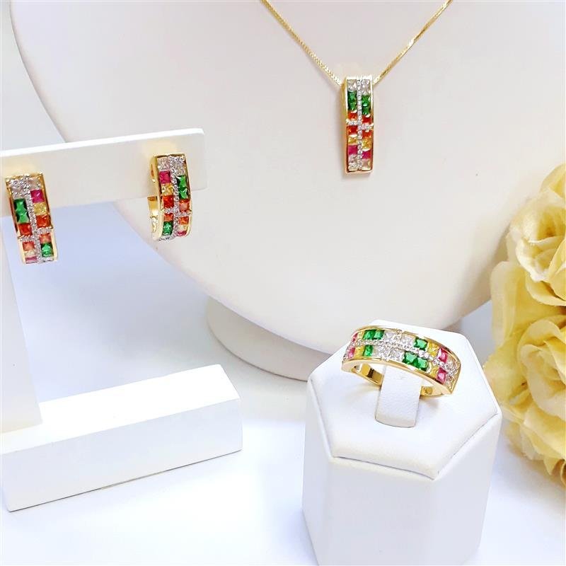 Dimensões Aproximadas: Comprimento:40 cm Extensor:5 cm Corrente: Veneziana Altura do Pingente: 2 cm Largura Pingente: 0,8 cm Pedras: Zircônias coloridas Peso:3,90 gr Aplicação: Ródio Branco Banho: Anti Alérgico