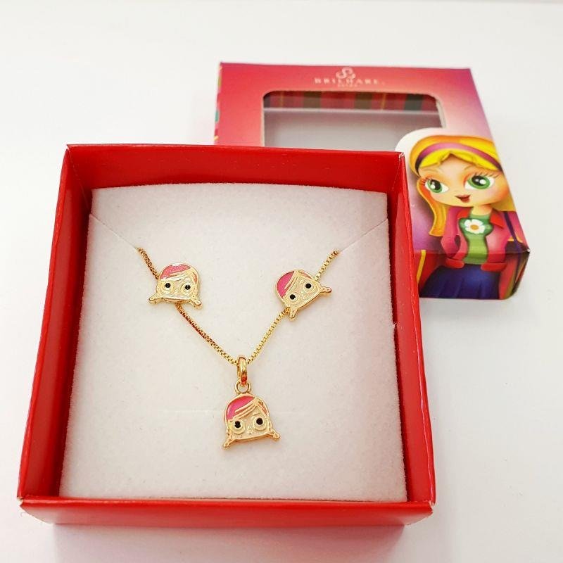 Diâmetro da corrente: 16 cms Diâmetro pingente 1,00 cms Diâmetro do brinco: 1,00 cms Aplicação de resina Peso 2,60 gr Folheado a ouro Banho antialérgico