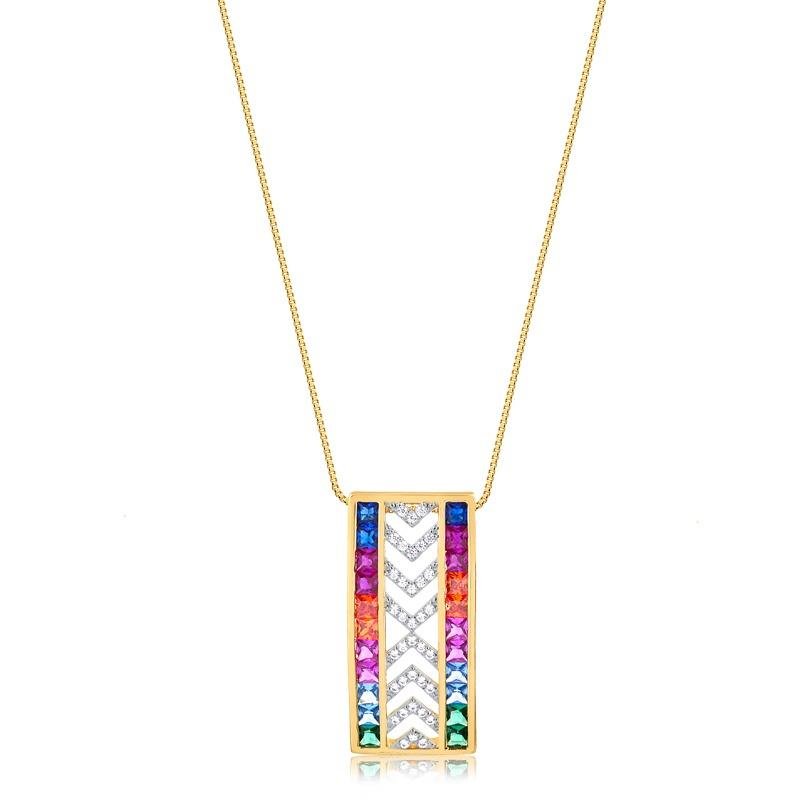 Dimensões Aproximadas: Comprimento:40 cm Extensor:5 cm Corrente: Veneziana Altura do Pingente: 2,7 cm Largura Pingente: 1,8 cm Pedras: Zircônias coloridas Peso: 5,40 gr Aplicação: Ródio Branco Banho: Anti Alérgico