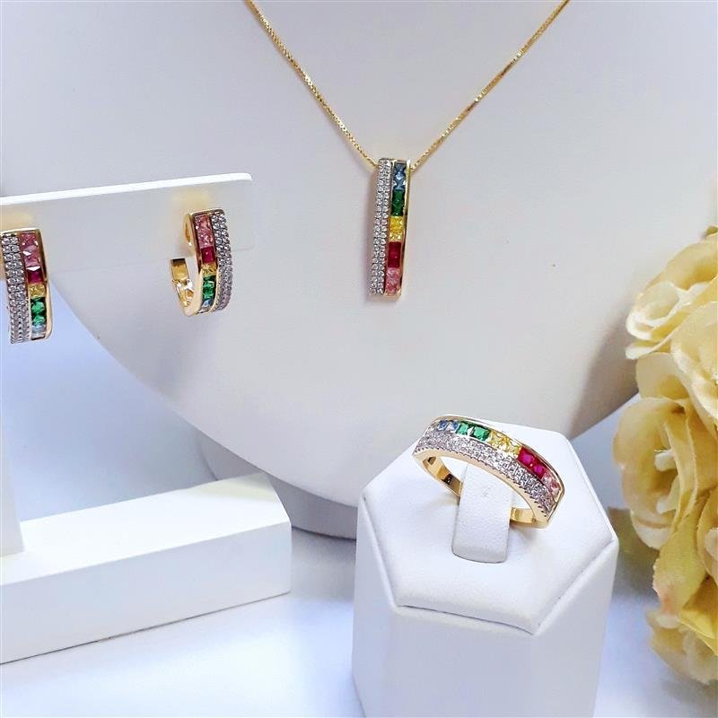 Dimensões Aproximadas: Comprimento:40 cm Extensor:5 cm Corrente: Veneziana Altura do Pingente: 2,5 cm Largura Pingente: 0,5 cm Pedras: Zircônias coloridas Peso: 4,30 gr Aplicação: Ródio Branco Banho: Anti Alérgico