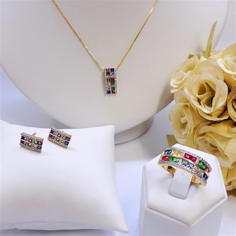 Dimensões Aproximadas: Comprimento:40 cm Extensor:5 cm Corrente: Veneziana Altura do Pingente: 2 cm Largura Pingente: 0,8 cm Pedras: Zircônias coloridas Peso: 4,20 gr Aplicação: Ródio Branco Banho: Anti Alérgico